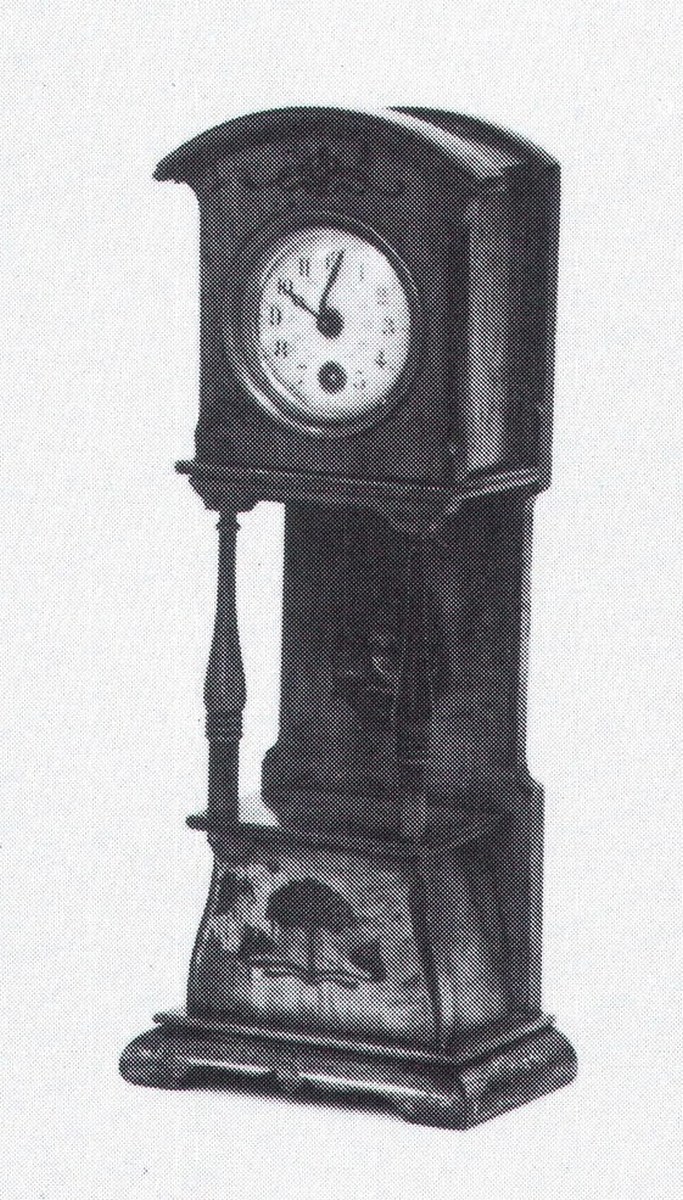 HORLOGE DE PARQUET légèrement galbée. Cage à fronton en demi-lune,...