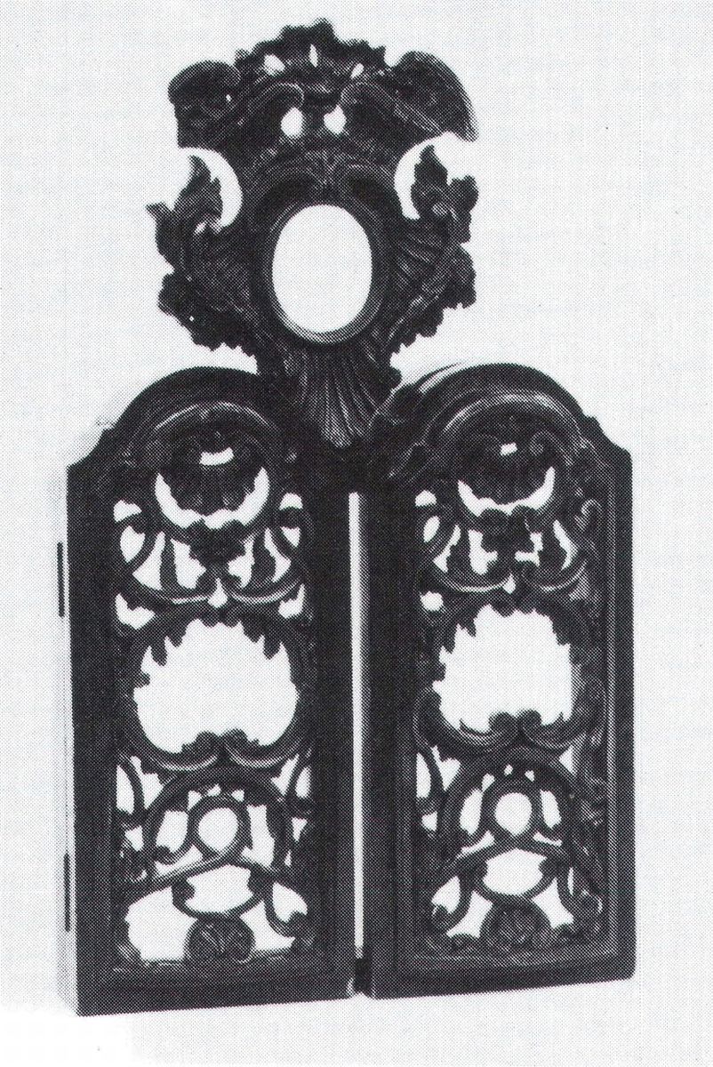 FAÇADE DE RELIQUAIRE en chêne et noyer ouvrant à deux vantaux entièrement sculptés et ajourés de rinceaux, palmettes, feuillages et surmontés d'un cadre circulaire d'où partent des flammes sculptées qui rattachent le cadre à la partie inférieure.