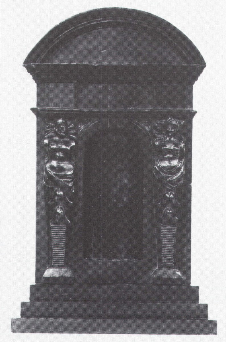 NICHE en chêne comprenant un fronton plein cintre mouluré, une corniche moulurée soutenue par deux thermes sur fond drapé regardant vers le centre : un masculin casqué et barbu torse nu, un féminin la tête enrubannée, la poitrine habillée d'un vêtement collant la soulignant. La base des thermes est ornée de deux feuilles d'acanthe superposées et d'un décor de stries. Au milieu une niche en arrondi, une feuille sculptée aux écoinçons, base en escalier à trois marches.