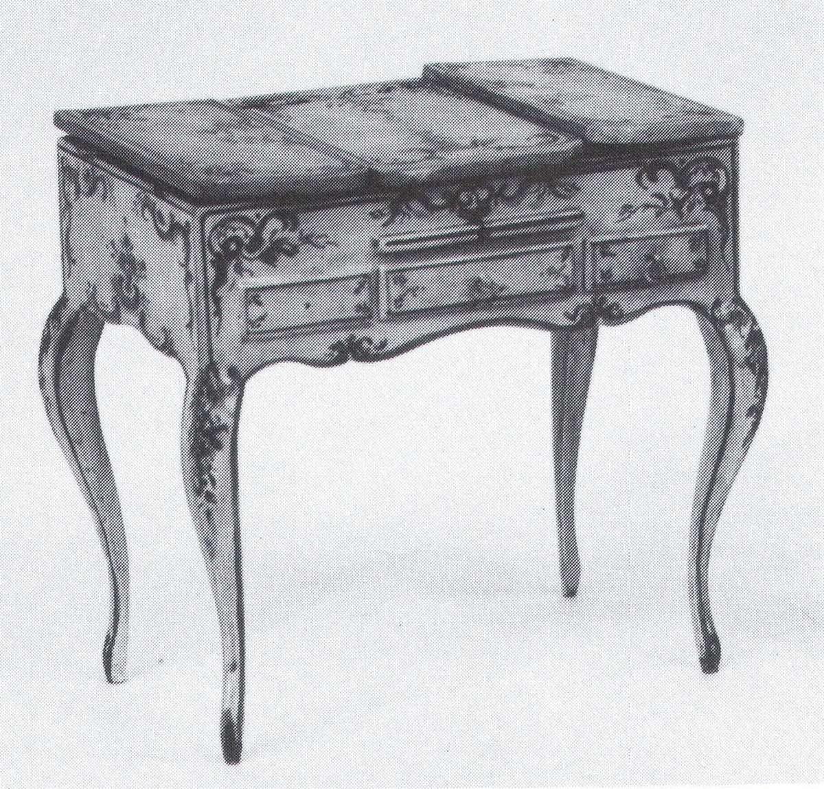 COIFFEUSE dont le panneau médian du dessus se retourne pour présenter le miroir qui le double entre deux casiers. Trois faux tiroirs en ceinture. Décor peint toutes faces à dominante de bleu turquoise et orange dans le style rocaille, guirlandes, arabesques, fleurs soulignant les lignes du meuble. Pieds galbés.
