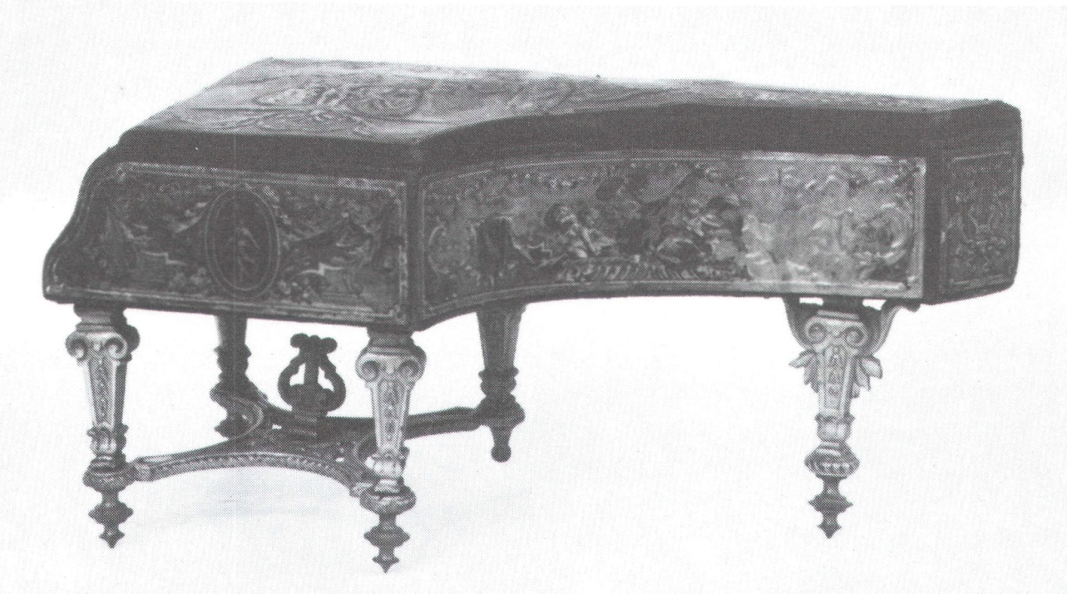 CLAVECIN, dont la partie supérieure s'ouvre, se transformant en coffret (une extrémité du clavecin renfermant un mécanisme de boîte à musique). Décoré de plaques métalliques toutes faces, peintes et légèrement en relief dans le goût du XVIIIe : putis jouant avec des instruments de musique, trois personnages dansant, une muse dans un médaillon, le tout inséré dans un système de guirlandes de fleurs, de drapé, de feuillages et d'arabesques.