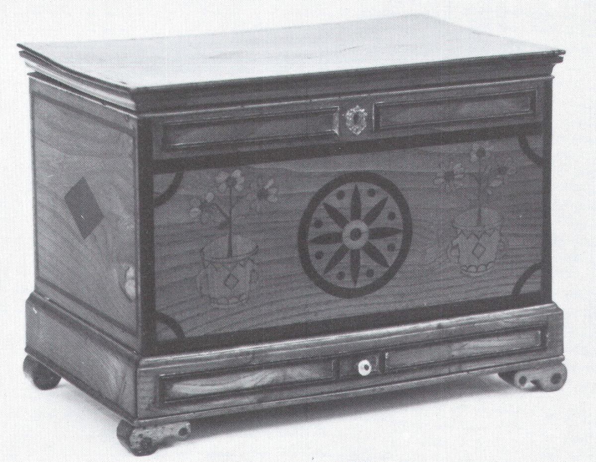COFFRE en placage de palissandre et citronnier. Il est orné d'un faux tiroir en ceinture et d'un vrai dans le soubassement, tous deux soulignés de baguettes d'ébène. Face marquetée en bois de couleur en son centre d'une rosace avec de chaque côté une fleur dans un pot.