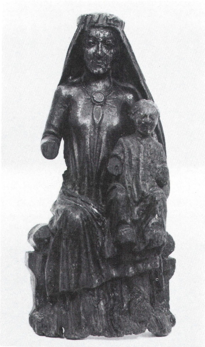 STATUE en bois représentant la Vierge à l'Enfant. Elle est couronnée et assise tenant l'Enfant sur son genou gauche. Dos évidé. Traces de polychromie.