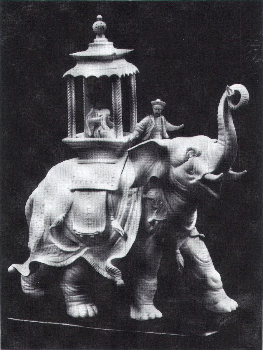 Intéressant SUJET EN BISCUIT en ronde-bosse représentant un éléphant, avec son palanquin à la courtisane et son cornac.