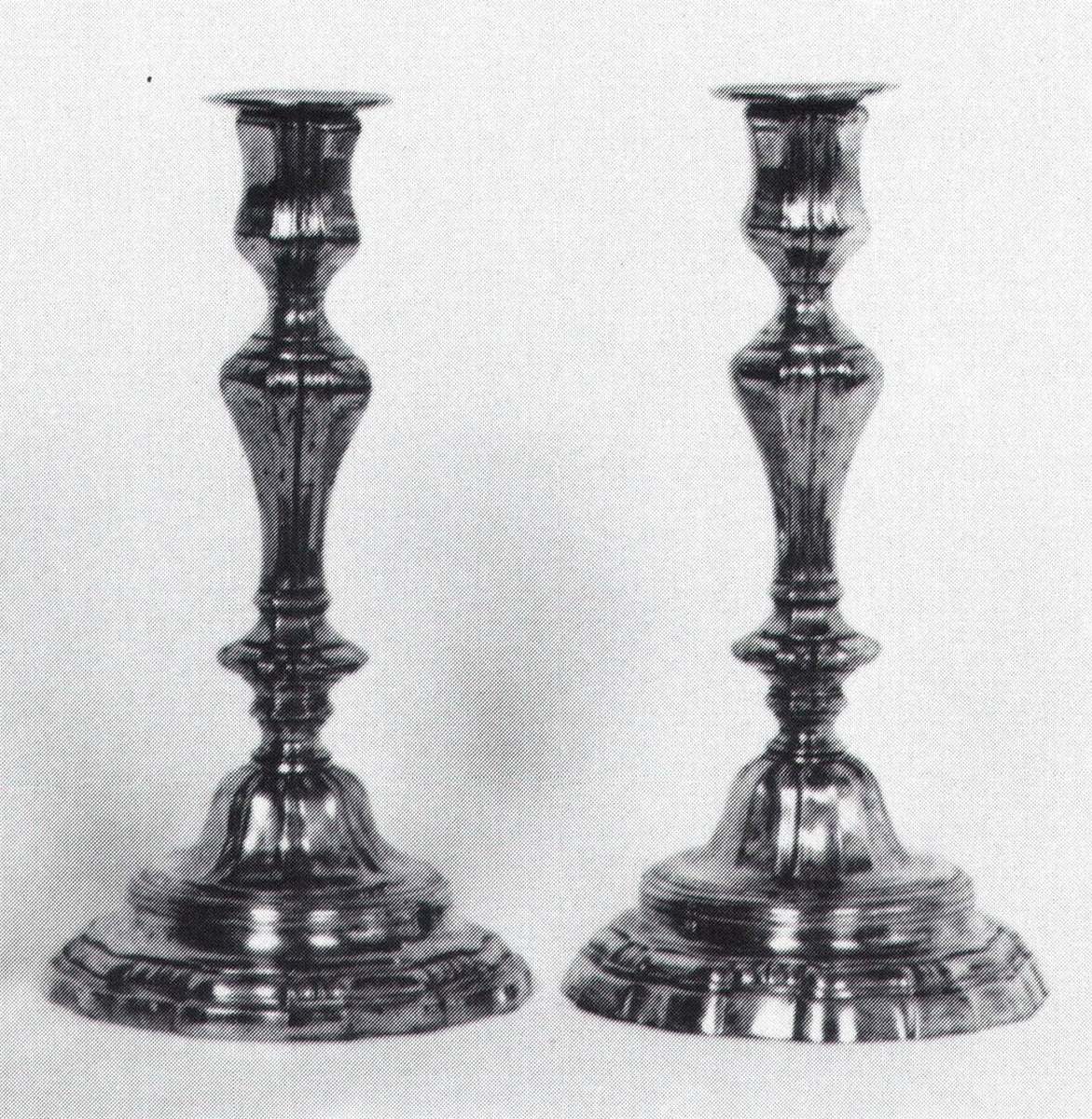 Paire de BOUGEOIRS en bronze ciselé et doré, fûts à pans coupés, bases mouvementées à filets (très petites différences dans les bases).