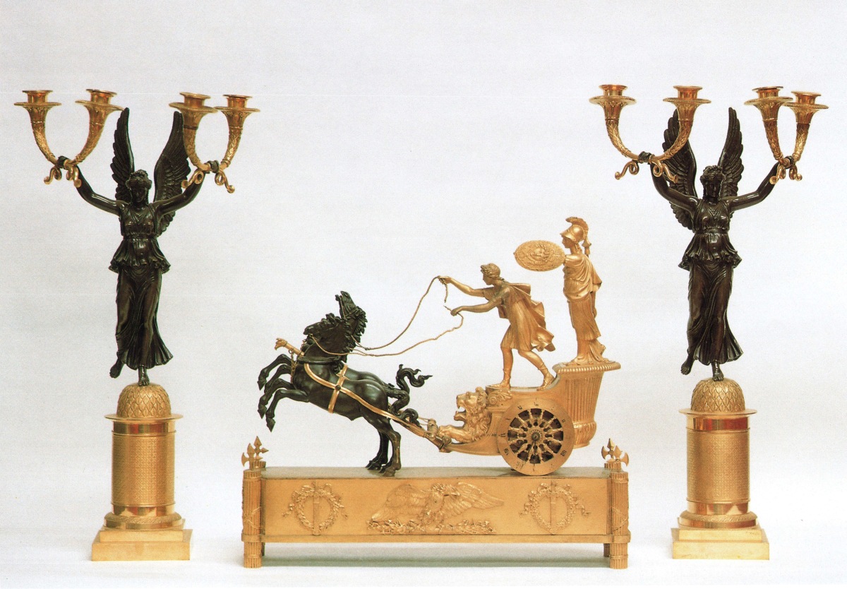 Paire de CANDÉLABRES à quatre lumières en bronze ciselé, doré et patiné. Les bras en forme de trompes sont supportés par des renommées, socle colonne à palmettes et dessins géométriques.
