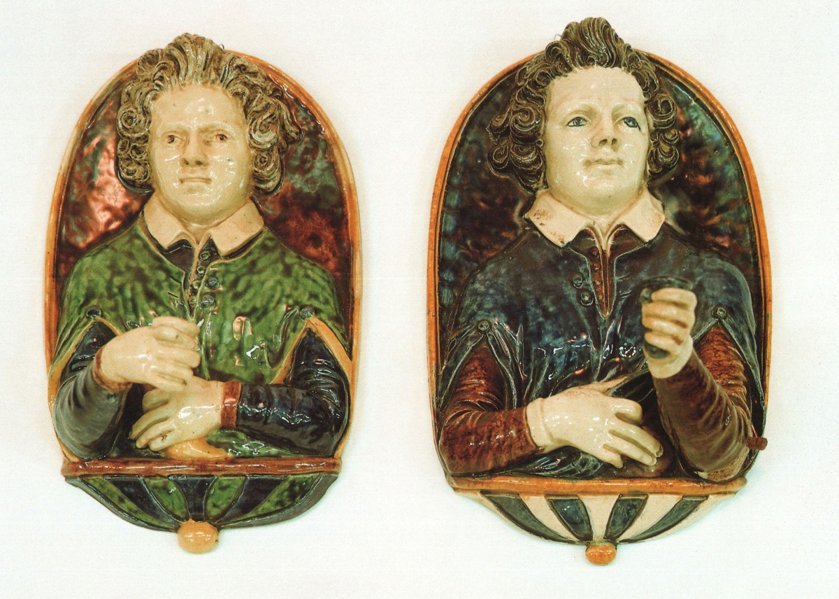 Paire de BRAS DE LUMIÈRE en céramique polychrome, représentant un buste de jeune homme en costume du XVIe siècle.