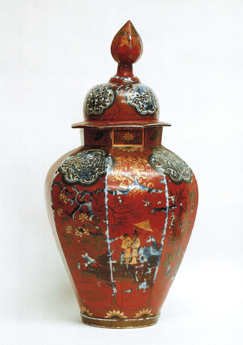 Elle est surdécorée de laque rouge, or et polychrome, à personnages et paysage.