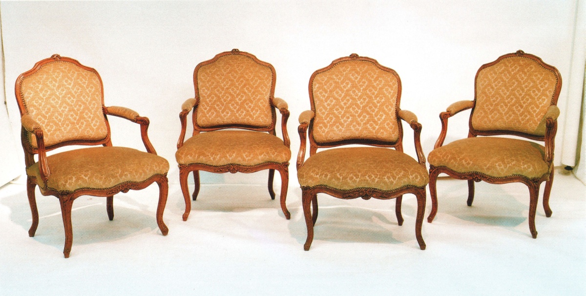 Belle SUITE DE QUATRE FAUTEUILS à dossier plat mouvementé, en bois naturel finement sculpté de fleurettes et feuillages; accoudoirs et pieds cambrés à nervures.