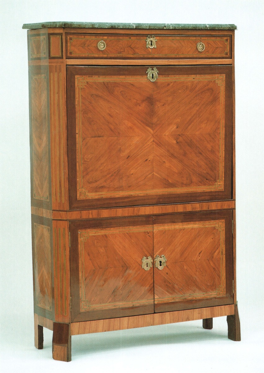 Il présente un tiroir, deux portes et un abattant qui découvre six petits tiroirs et des casiers. Montants à pans coupés à fausses cannelures, petits pieds (restaurés).