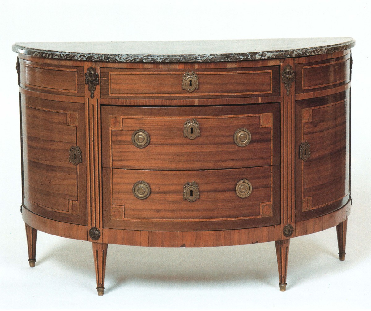 Belle COMMODE demi-lune en placage de bois de rose dans des encadrements à filets et rosaces feuillagées, elle ouvre par deux portes latérales et trois tiroirs dont deux sans traverse. Montants plats et pieds fuselés à cannelures simulées. Ornements de bronze à guirlandes.