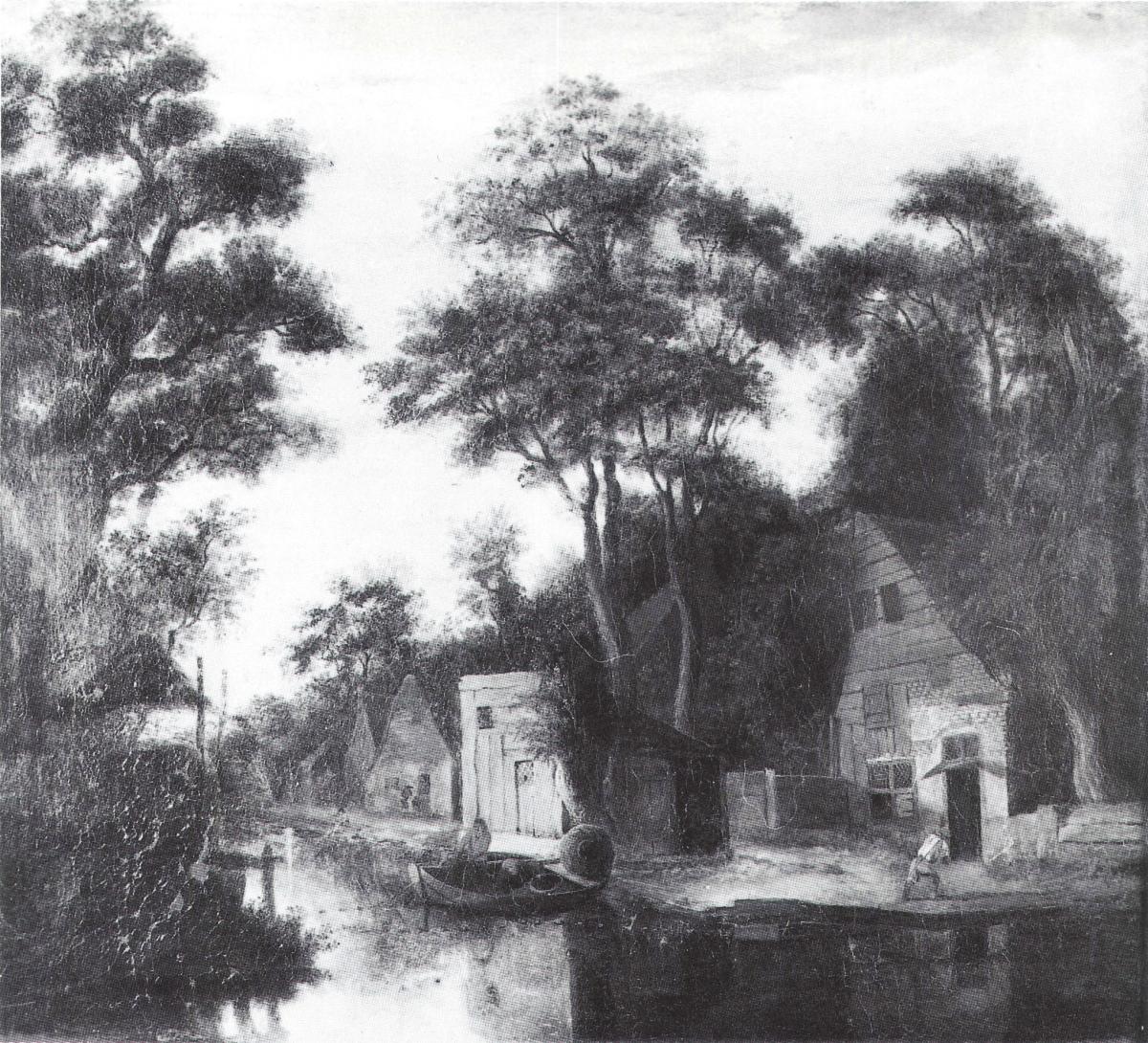 ECOLE HOLLANDAISE DU XVIIème siècle. Le village de pêcheurs. Huile sur toile. Un tableau comparable attribué à Cornélis-Gorritsz DECKERT (mort en 1678), est conservé dans la salle dite« du Vélasquez », au Musée des Beaux Arts d'Orléans. Il s'agit d'un don de Madame d'Autroche en 1825. Elève de Salomon RUYSDAEL, DECKER aimait tout particulièrement représenter les murailles en ruine, les chaumières perdues le long d'un cours d'eau. Ici, l'artiste a reproduit avec minutie la décrépitude des bâtisses dont les murs se disjoignent. De beaux arbres et une lumière très douce se reflètant dans les eaux tranquilles du canal confèrent à l'ensemble une certaine mélancolie mais aussi une grande impression de calme et de sérénité.