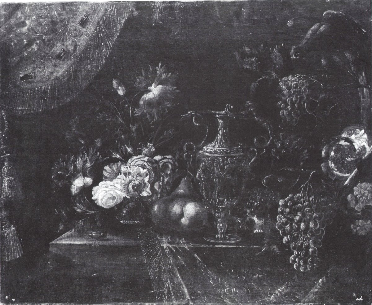 ECOLE FLAMANDE vers 1700. Nature morte de fleurs, fruits et...