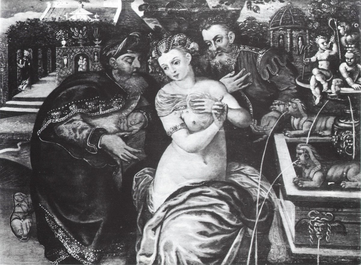 Entourage de Jan MASSYS (1505-1575). Suzanne et les vieillards. Panneau de chêne, parqueté. Usures et restaurations.