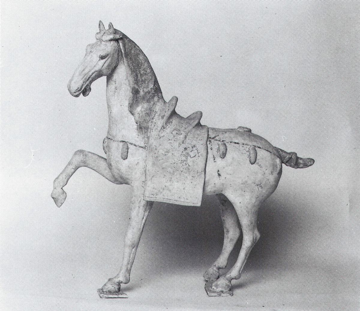 CHEVAL harnaché à l'arrêt, l'antérieur droit levé, en terre cuite recouverte d'un engobe blanc et polychromie rouge et noire. Chine, époque Tang (accident à la terrasse).