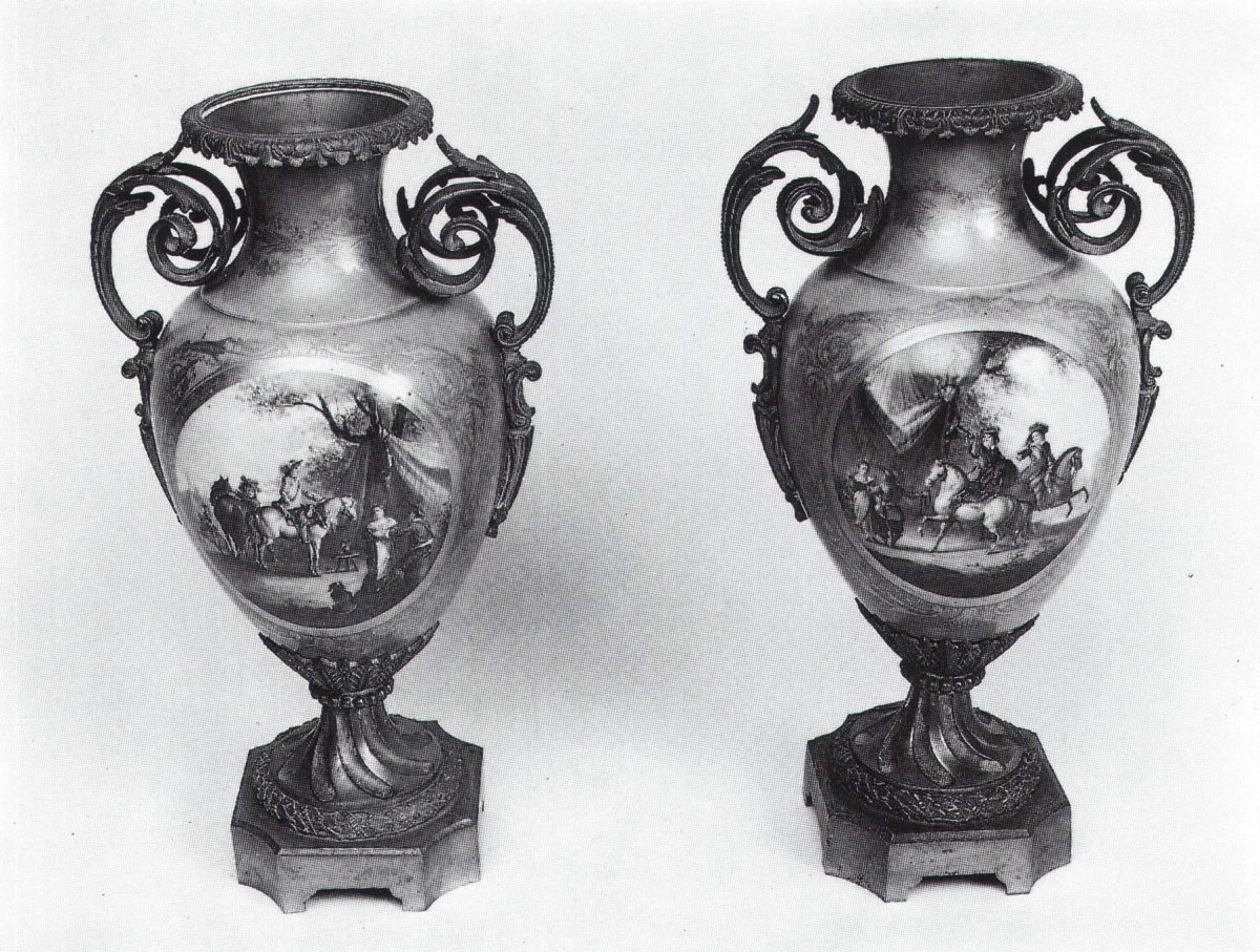 SEVRES (genre de) : Paire de VASES amphores en porcelaine bleue et or, à décor polychrome dans des réserves de scènes de campements militaires et grivoises dans le goût du XVIIème siècle. Monture en bronze doré et ciselé: piédouche et socle, anses à enroulement. Style Louis XVI, Impératrice.