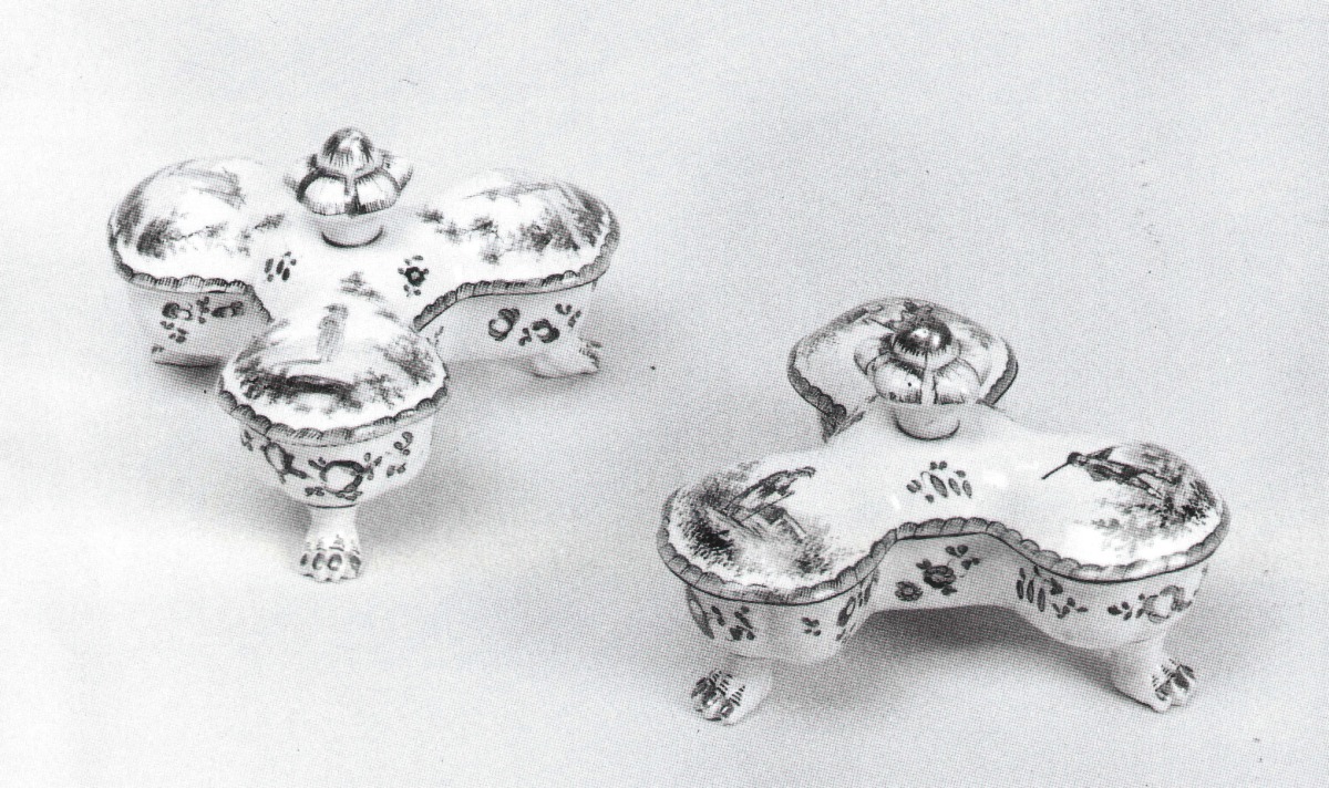 Paire de BOITES A EPICES. Décor de petit feu polychrome à rehauts or, composition champêtre et personnages inspirés de WATTEAU. Marque : R.X en rouge au pinceau, fabrique de ROBERT, Marseille, vers 1760-1780.