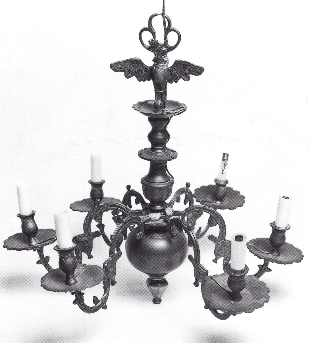 LUSTRE hollandais à six bras de lumière, en bronze ciselé, à décor d'aigle couronné, de feuilles d'acanthe, de rinceaux et de galons. XVIIème siècle (restaurations).
