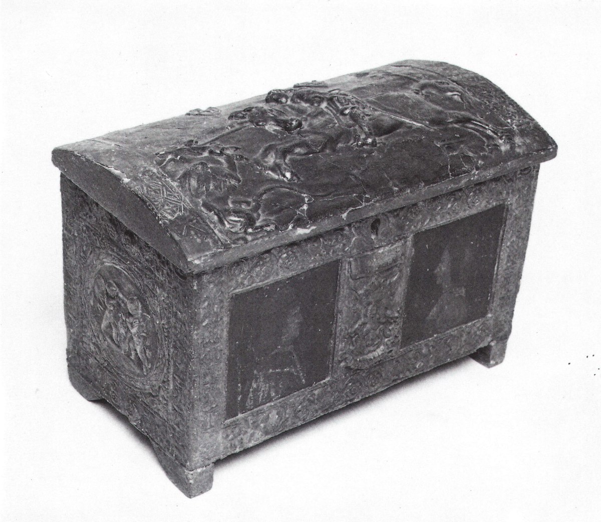 COFFRET en forme de malle, à couvercle bombé, en bois recouvert d'un décor de stuc en relief peint et doré. Sur la face sont peints deux portraits, au revers lion de Saint Marc et écussons d'armoiries. Sur chaque côté, deux putti ailés présentant un écusson d'armoirie. Sur le couvercle, St Georges à cheval terrassant le dragon. Ancien travail vénitien.