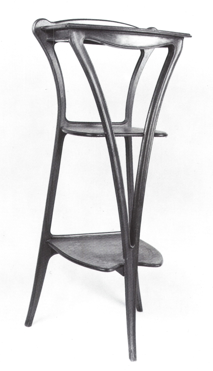 SELLETTE à trois plateaux en marqueterie à décor floral d'ancolies. Pied antérieur en fourche formant support de la tablette supérieure; lignes coup de fouet. Signature gravée sur le plateau supérieur : L. MAJORELLE. Nancy.