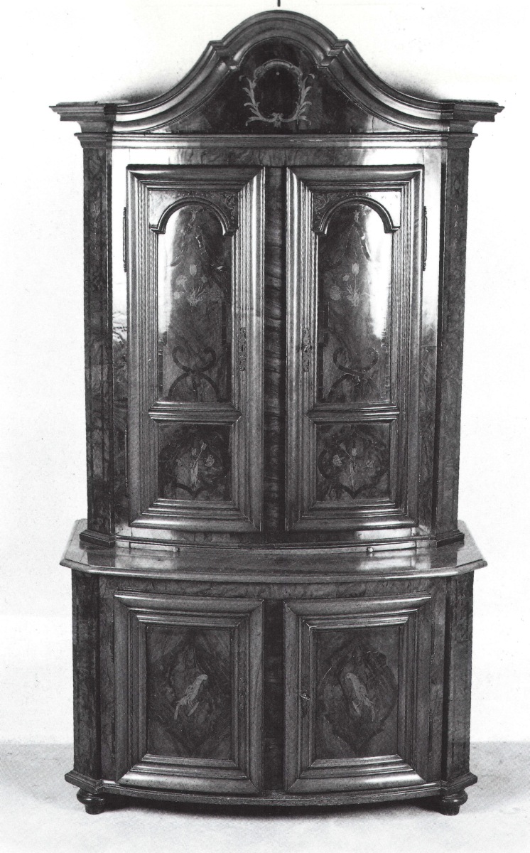 ARGENTIER, à façade bombée, en noyer et loupe de noyer, à décor marqueté d'œillets, de tulipes et de perroquets. Il ouvre par quatre vantaux à fortes moulures et deux tirettes. Pans coupés, corniche en chapeau de gendarme, pieds boule. Armoire de présentation à l'intérieur, avec étagères sinueuses et tiroirs. Epoque Louis XIV, Hollande, première moitié du XVIIIème siècle.