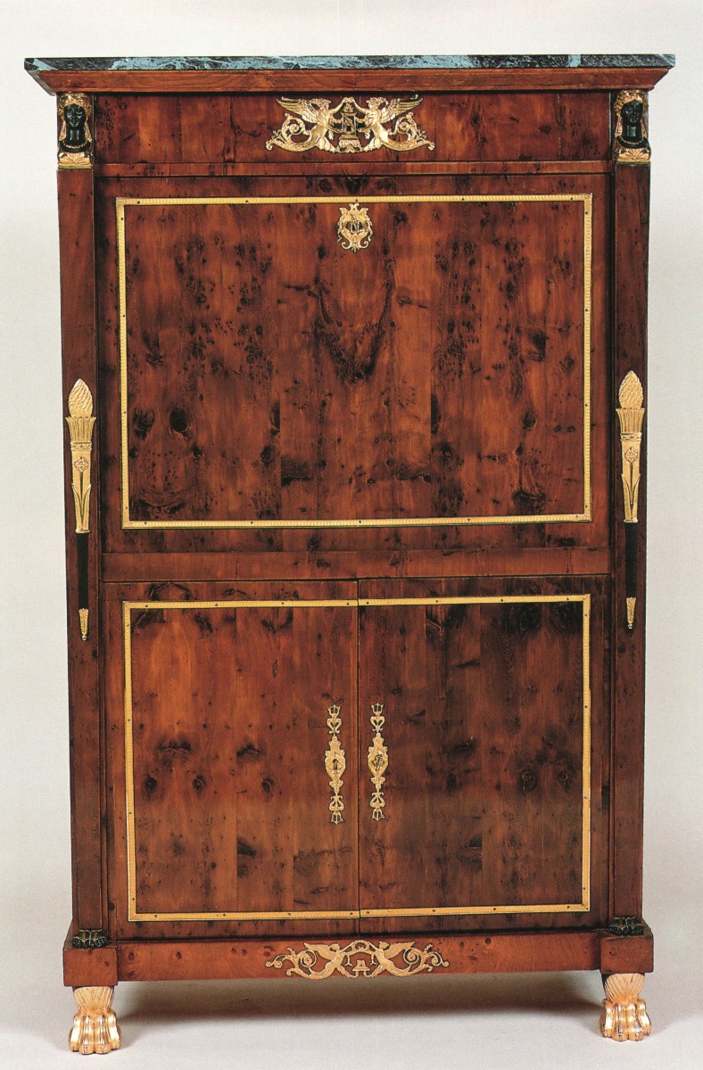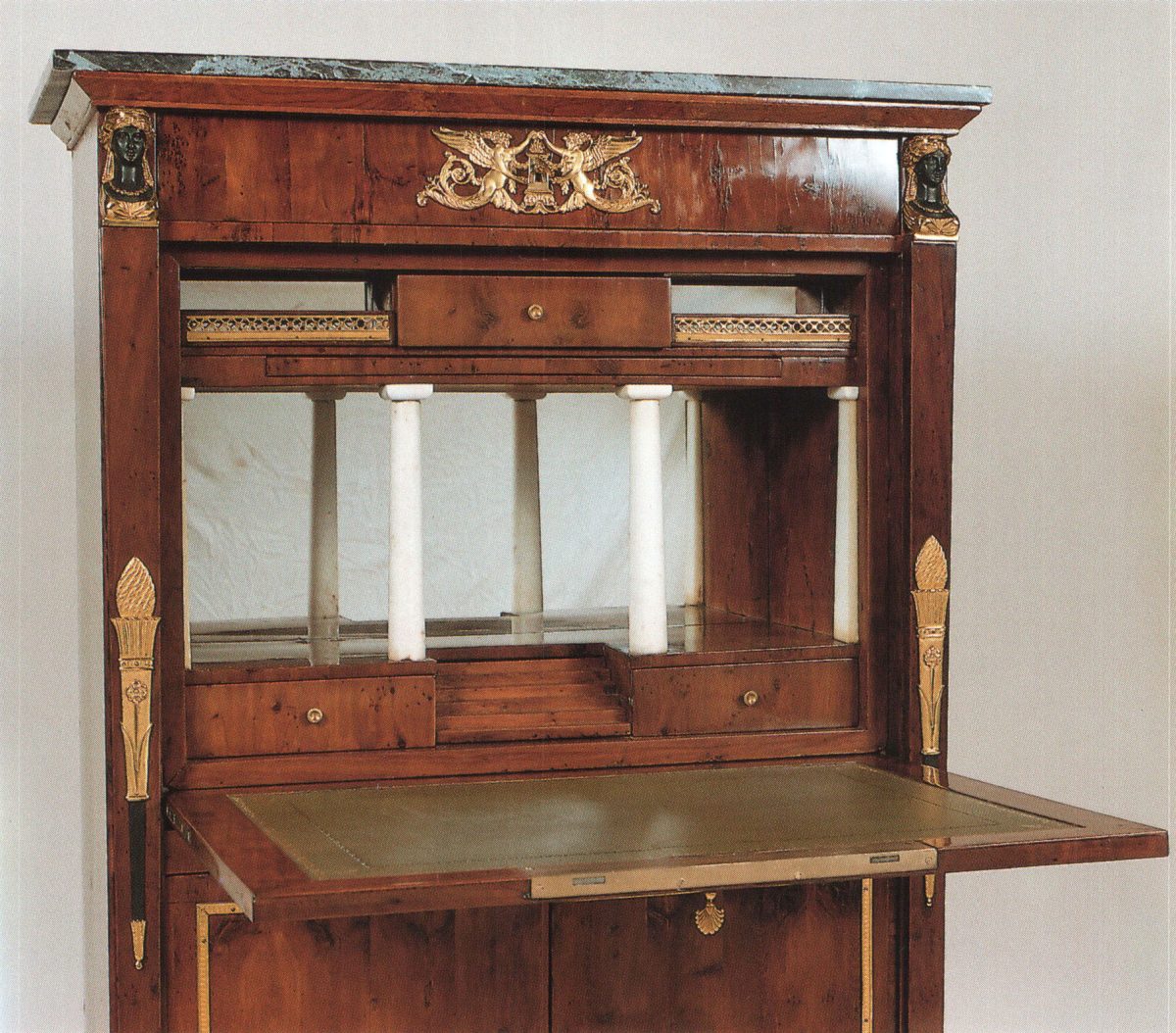 SECRETAIRE VERTICAL en acajou et placage d'acajou de Cuba moucheté. Il présente un tiroir dans sa partie supérieure, un abattant découvrant un portique à colonnes d'albâtre dont le soubassement est formé de deux tiroirs encadrant un petit escalier et l'entablement à tirette à mécanisme est surmonté d'un tiroir avec de chaque côté un casier amovible présentant en façade une galerie de bronze doré et ajouré. Dans la partie inférieure, deux vantaux découvrent un tiroir. Cariatides formant pilastres au niveau des montants se terminant par des pieds en sarcophage. Pieds antérieurs en griffe, dorés; pieds postérieurs tournés en chapelet peints en vert imitant le bronze antique. Belle ornementation de bronzes dorés ou amatis: torchères, lotus, cariatides et victoires ailées. Dessus marbre vert antique. Epoque Directoire-Retour d'Egypte (restaurations).