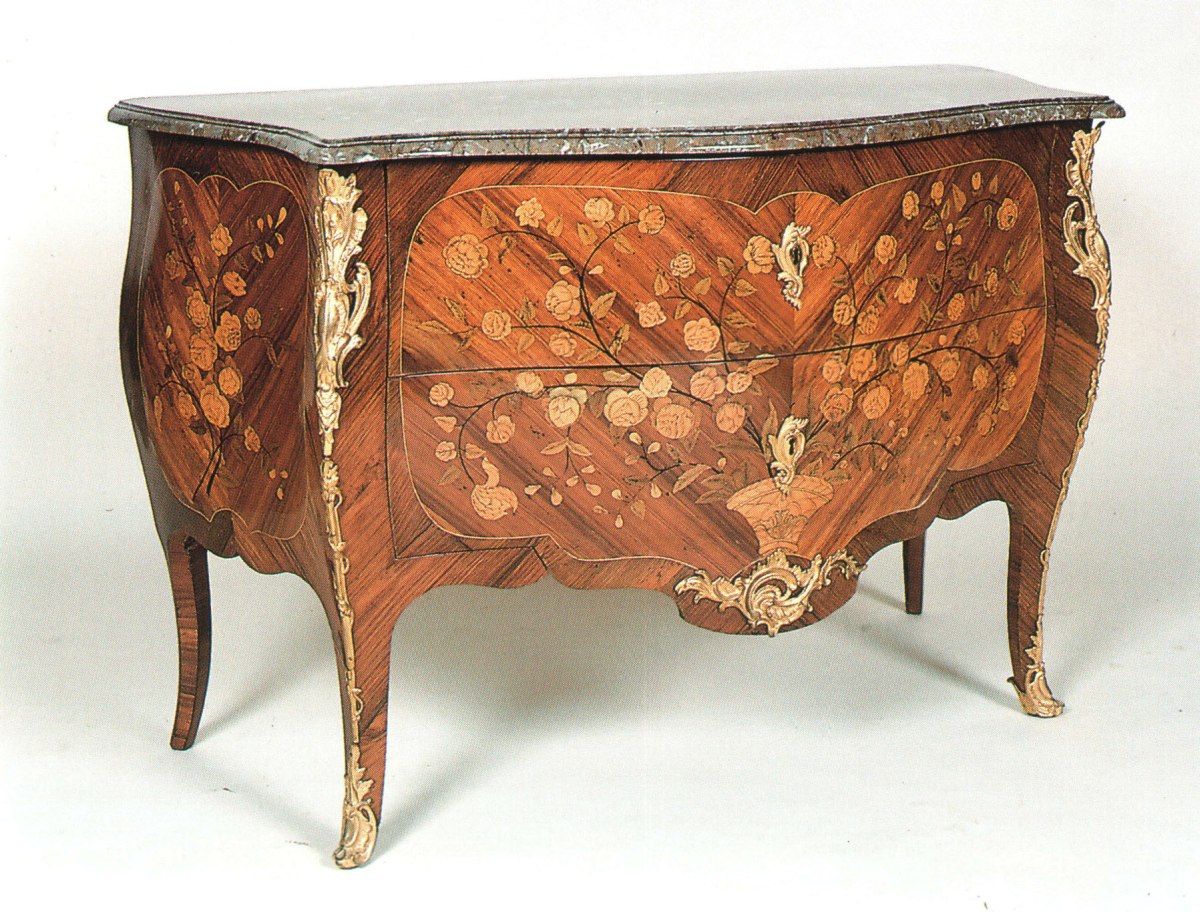 Belle COMMODE galbée à deux rangs de tiroir sans traverse. Elle est en bois de placage de rose et de violette, marquetée sur la façade et les côtés, dans des réserves, de fleurs et de feuillages. Belle ornementation de bronzes ciselés et dorés à décor de rocailles et de rinceaux feuillagés, en chute, sabots, cul de lampe et entrées de serrures. Dessus de marbre de Sarrancolin. Estampille C. WOLFF. Epoque Louis XV. Christophe WOLFF, reçu maître le 10 décembre 1755.