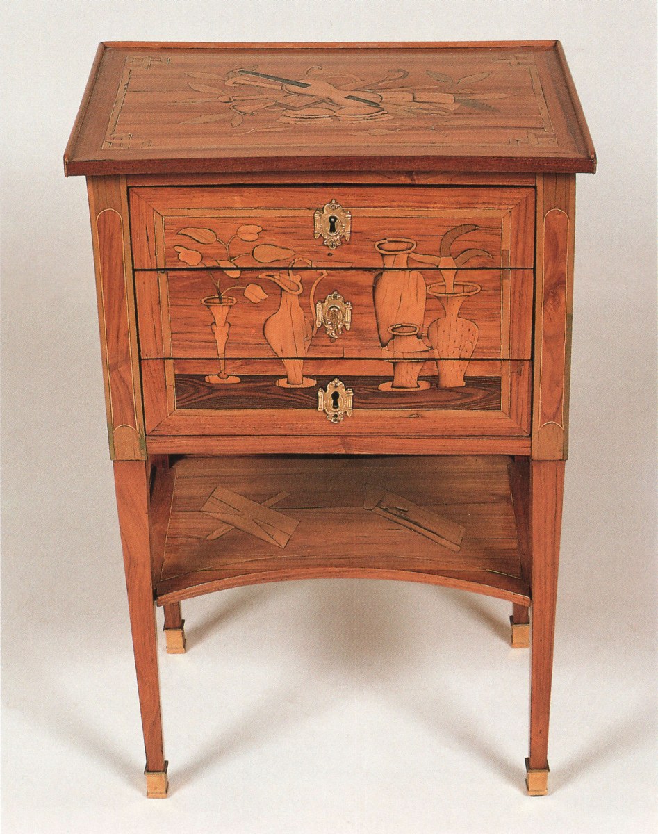 Ce répertoire décoratif est caractéristique du décor en marqueterie des meubles de TOPINO : objets domestiques, vases et livres.
