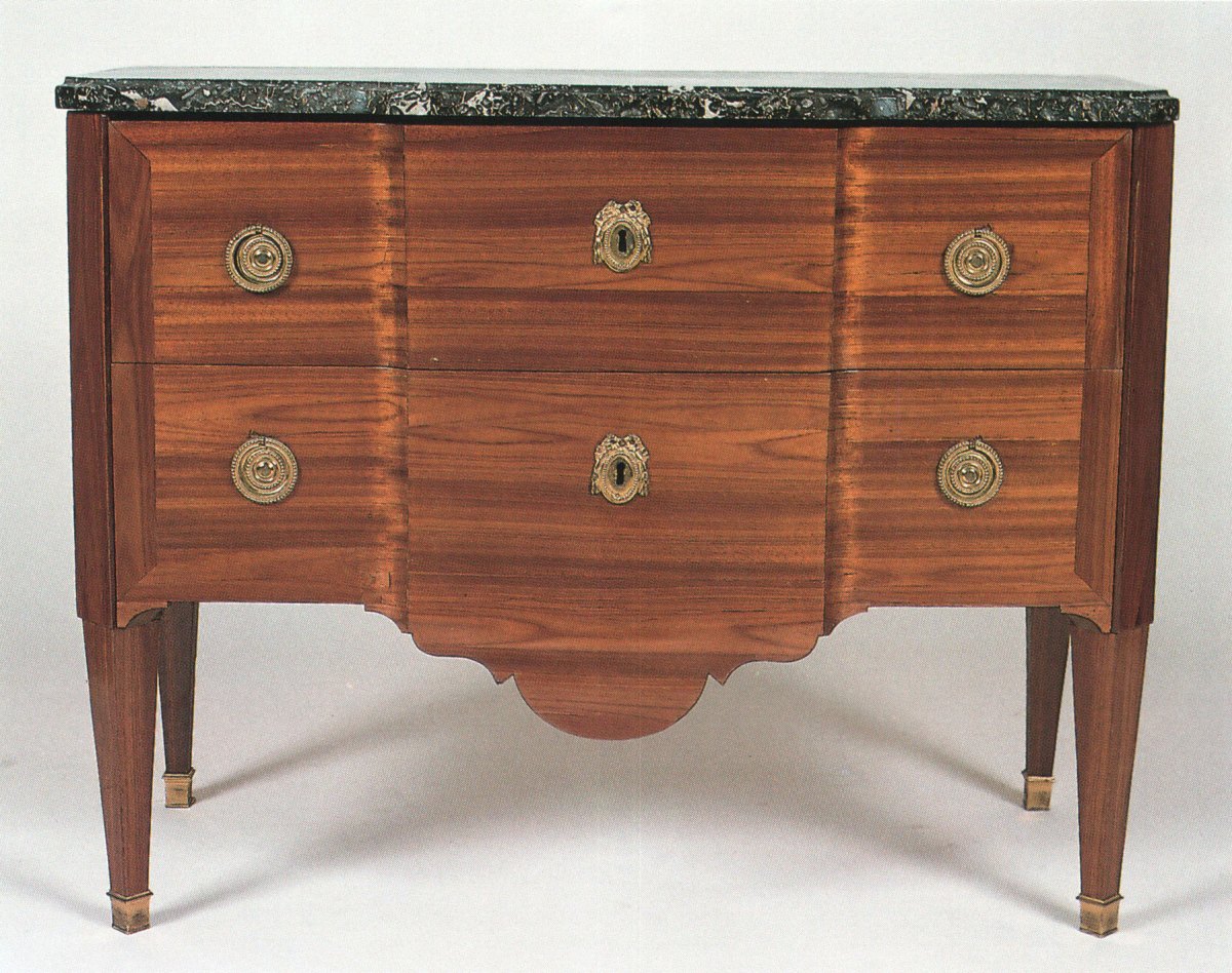 COMMODE en bois de placage exotique (satiné ?), à ressaut central, ouvrant à deux tiroirs sans traverse. Pans coupés, pieds gaine, les pieds antérieurs se présentent de trois quart. Poignées mobiles et entrées de serrure en bronze doré à décor de médaillons et de perles. Dessus de marbre gris. Estampille de P. ROUSSEL. Epoque Louis XVI. Pierre ROUSSEL, reçu maître le 21 août 1745.