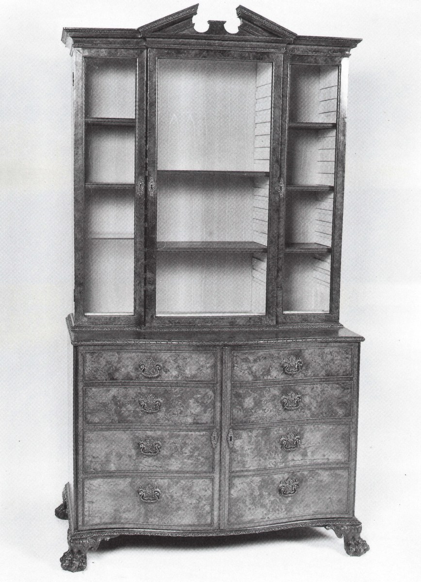 MEUBLE DEUX CORPS en noyer et en placage de loupe de noyer. Partie supérieure ouvrant par une porte vitrée encadrée de deux portes vitrées en retrait; corniche à fronton brisé. Partie inférieure galbée, en avancée, ouvrant par deux abattants présentant chacun quatre faux tiroirs; pieds griffe. Décor mouluré et sculpté de frises d'oves et de demi fleurs. Angleterre, première moitié du XVIIIème siècle.