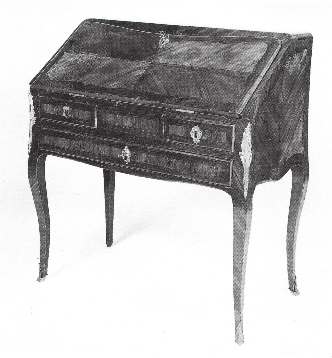 BUREAU DE PENTE en placage de bois de rose et de bois de violette, toutes faces, en aile de papillon sur l'abattant et les côtés. Il ouvre par un abattant dissimulant quatre tiroirs, des casiers et un tiroir secret, et deux rangs de tiroirs en ceinture dont deux dans la partie supérieure. Pieds cambrés. Ornementation de bronzes dorés. Estampille de L. MALLE. Epoque Louis XV. Louis Noel MALLE, reçu maître le 18 novembre 1765.