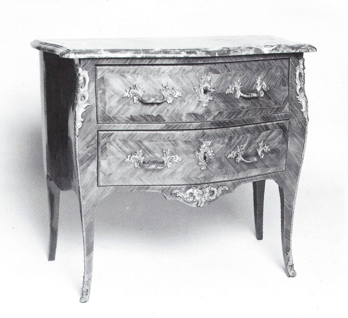 COMMODE galbée, en placage de bois de palissandre, à deux rangs de tiroir. Belle ornementation de bronzes dorés, entrées de serrure, poignées de tirage, tablier, chute des pieds. Estampille de LARDIN. Epoque Louis XV. Dessus de marbre brèche rouge royal. André Antoine LARDIN, reçu maître le 1 Juillet 1750.