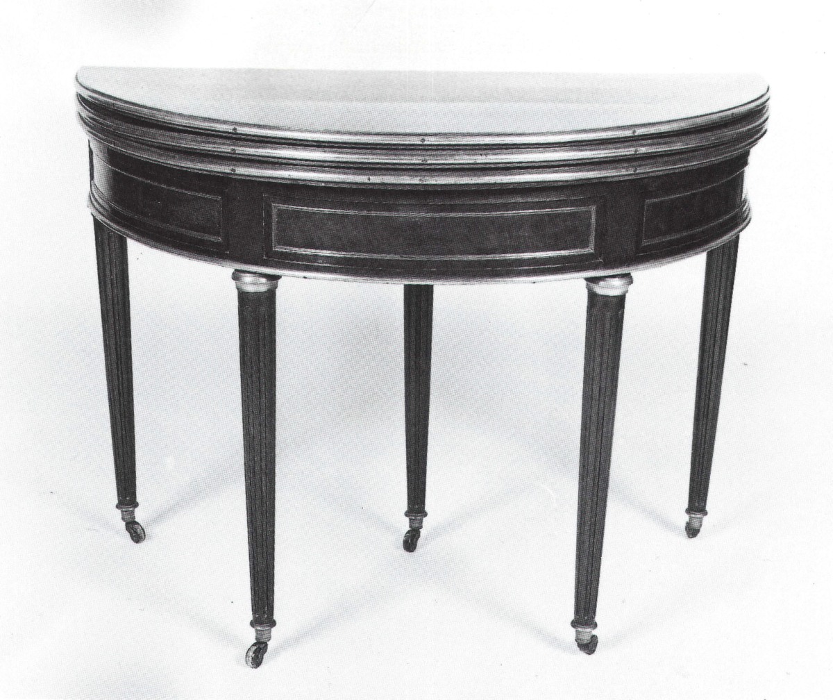 TABLE demi-lune en acajou, à trois volets pouvant former table ronde à plateau en acajou ou table à jeux. Pieds cannelés montés sur roulettes. Décor de demi-joncs et de baguettes en bordure du plateau, des panneaux de la ceinture, au sommet des pieds; sabots en bronze. Epoque Directoire.