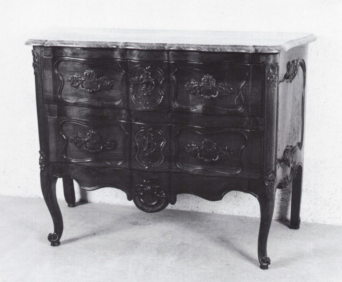 COMMODE galbée sur trois faces, en noyer mouluré et richement sculpté de coquilles et feuilles d'acanthe. Façade arbalète à deux tiroirs. Piétement cambré. Mains et entrées de serrures en bronze. Epoque Régence-Louis XV, travail du sud de la France (Arlésien ?). Dessus marbre bleu turquin.