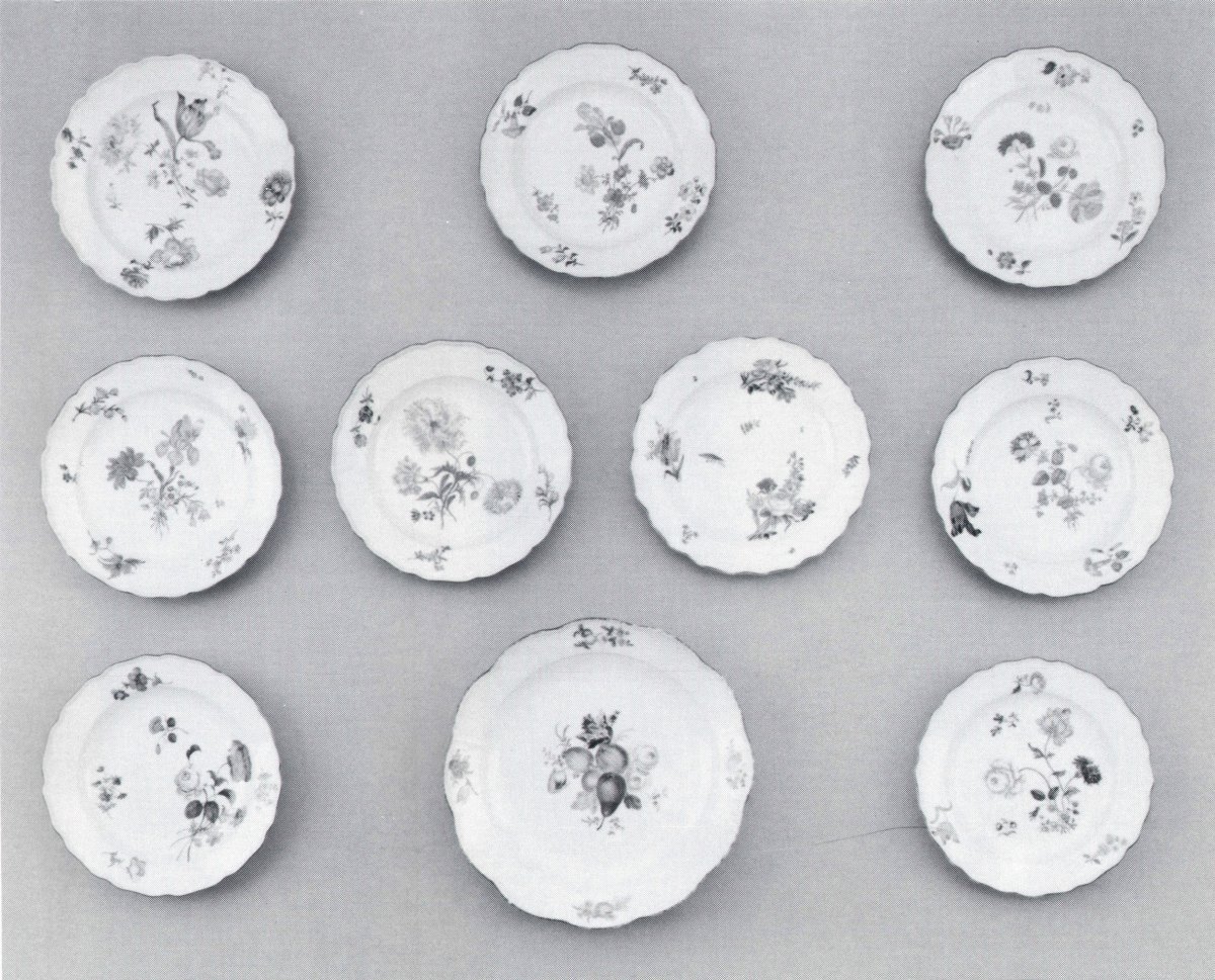 PLAT rond, en porcelaine, à bord festonné, filet doré, et motifs de tresses en relief sur l'aile. Décor polychrome peint de fleurs et fruits. (Egrenures.)