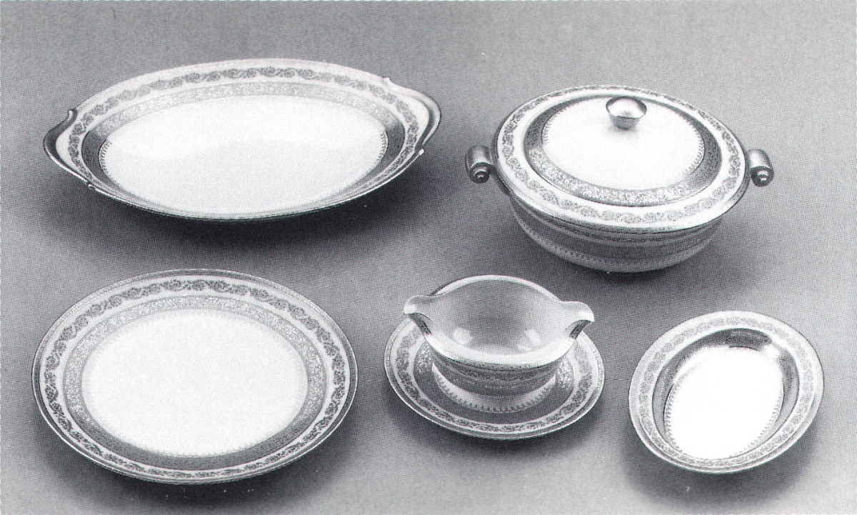 SERVICE, en porcelaine de LIMOGES, blanc et or, à décor « Altesse» de chez Raynaud. Décor de rinceaux et feuillages, en or amati et brillant, au répertoire iconographique du début du XIXe. L'ensemble de 74 pièces comprend: 36 assiettes plates, 12 assiettes creuses, 12 assiettes à dessert, 3 jattes à fruits, 2 raviers, 2 légumiers, 2 plats ovales, 2 plats ronds, 1 saucière, 1 saladier, 1 soupière.