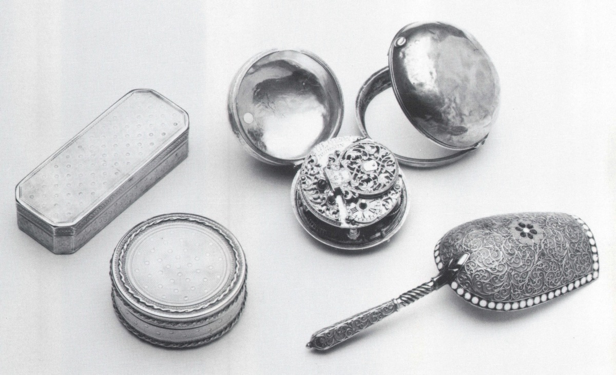 TABATIÈRE en or, de forme ronde. Décor toutes faces de semis de perles sur fond ciselé à bordures festonnée. Galons à 2 ors torsadés sur fond amati.
