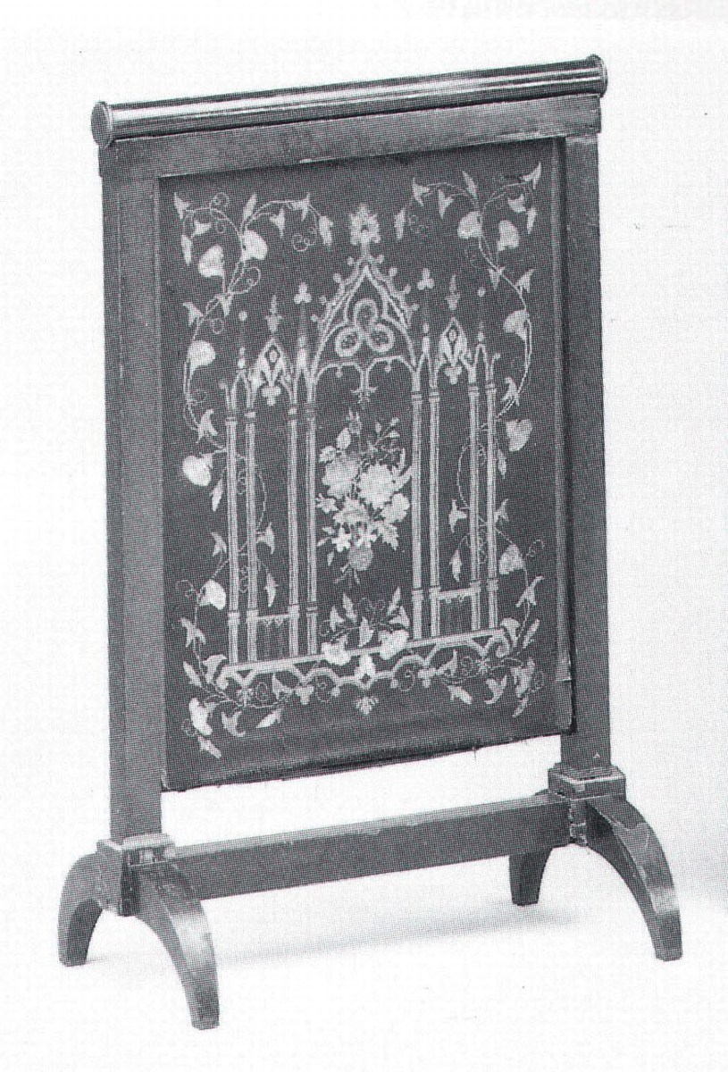 ÉCRAN DE CHEMINÉE, en placage d'acajou. Tapisserie de petit point au décor « à la cathédrale », bouquet, et tiges fleuries de liserons. (Accidents.)