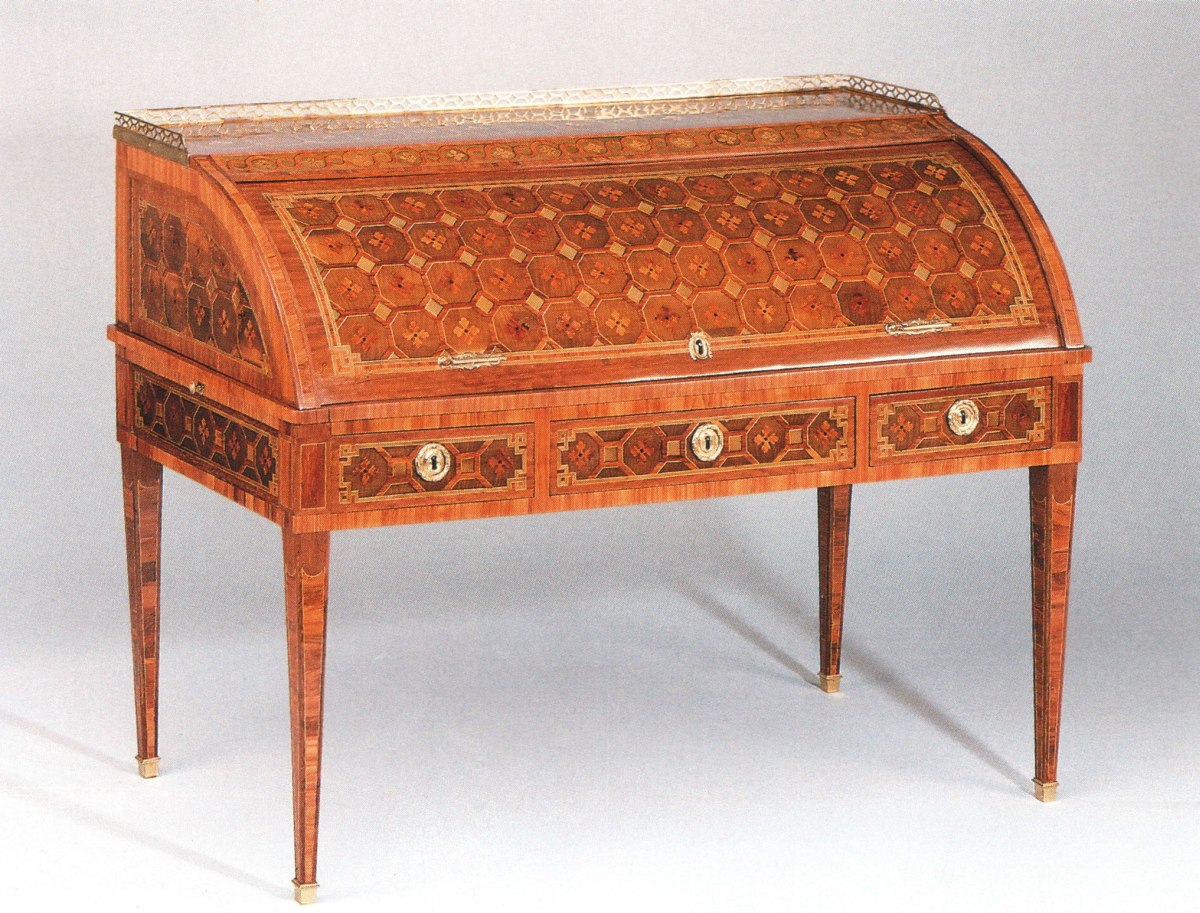 BUREAU SECRÉTAIRE A CYLINDRE, en bois de placage. Il ouvre à un cylindre ― découvrant tiroirs et casiers ― et une rangée de trois tiroirs; tablette coulissante intermédiaire et tirettes latérales. Pieds gainés. Décor toutes faces de marqueterie, alternant essences claires ou teintées en vert : filets, frise d'entrelacs, encadrement de grecques, quatre-feuilles, carrelages octogonaux et cubes. Ornementation en bronze: galerie ajourée, entrées de serrures, sabots.