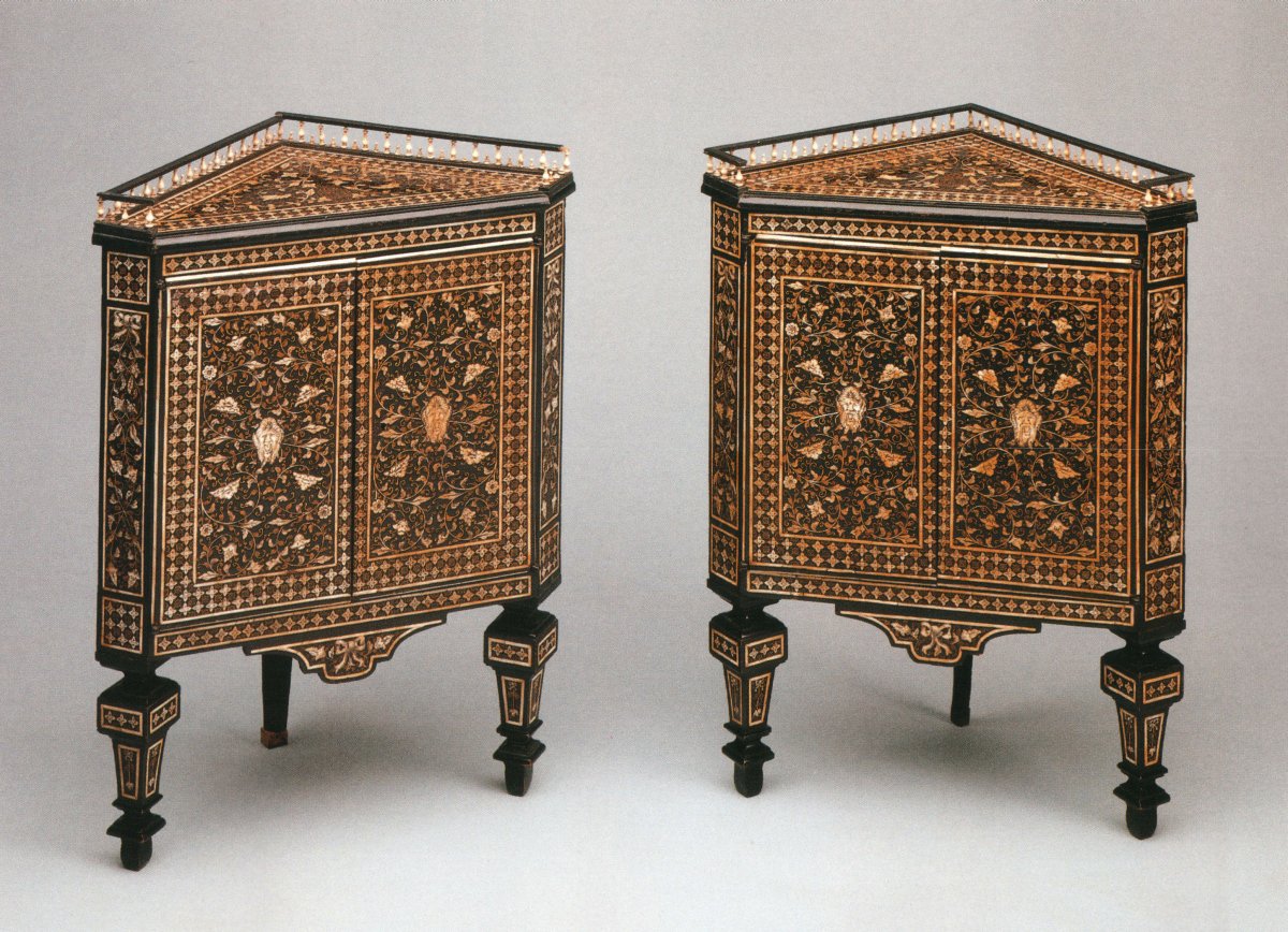 Paire d'ENCOIGNURES, en ébène et bois noirci, ouvrant à deux vantaux, reposant sur pieds antérieurs gaines. Exceptionnelle marqueterie en ivoire ciselé de rinceaux feuillagés et fleuris, masques de grotesques, rubans noués, étoiles. Rehauts de dorure: feuilles et volutes, motifs géométriques, et armoiries. Plateau orné d'une galerie à balustres d'ivoire. Estampille : PACELLI.
