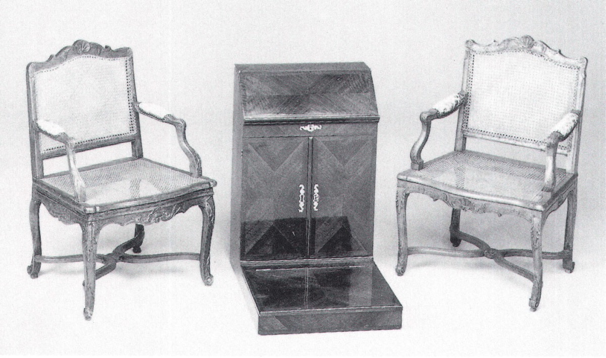 PRIE-DIEU, en placage d'amarante toutes faces, à jeu de frisage, ouvrant à un pupitre, une armoire à deux vantaux, et un coffret pour la plate-forme. Entrées de serrures en métal ouvragé. Marque au fer au dos d'une communauté religieuse: HG.