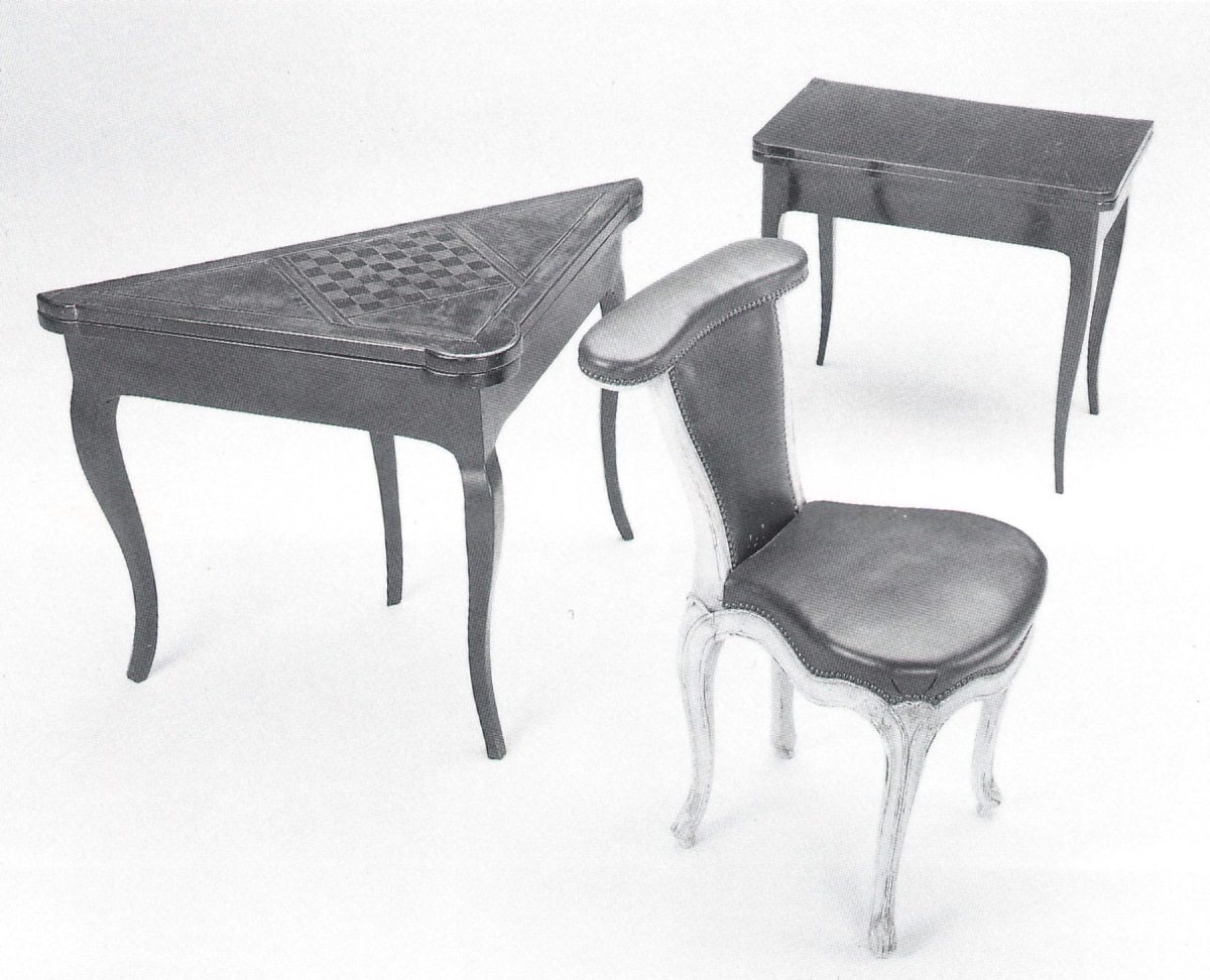 Curieuse CHAISE PONTEUSE en bois repeint gris mouluré, les hauts de pieds à fines cannelures en éventail. Pieds cambrés à nervures, le haut du dossier à large accoudoir.