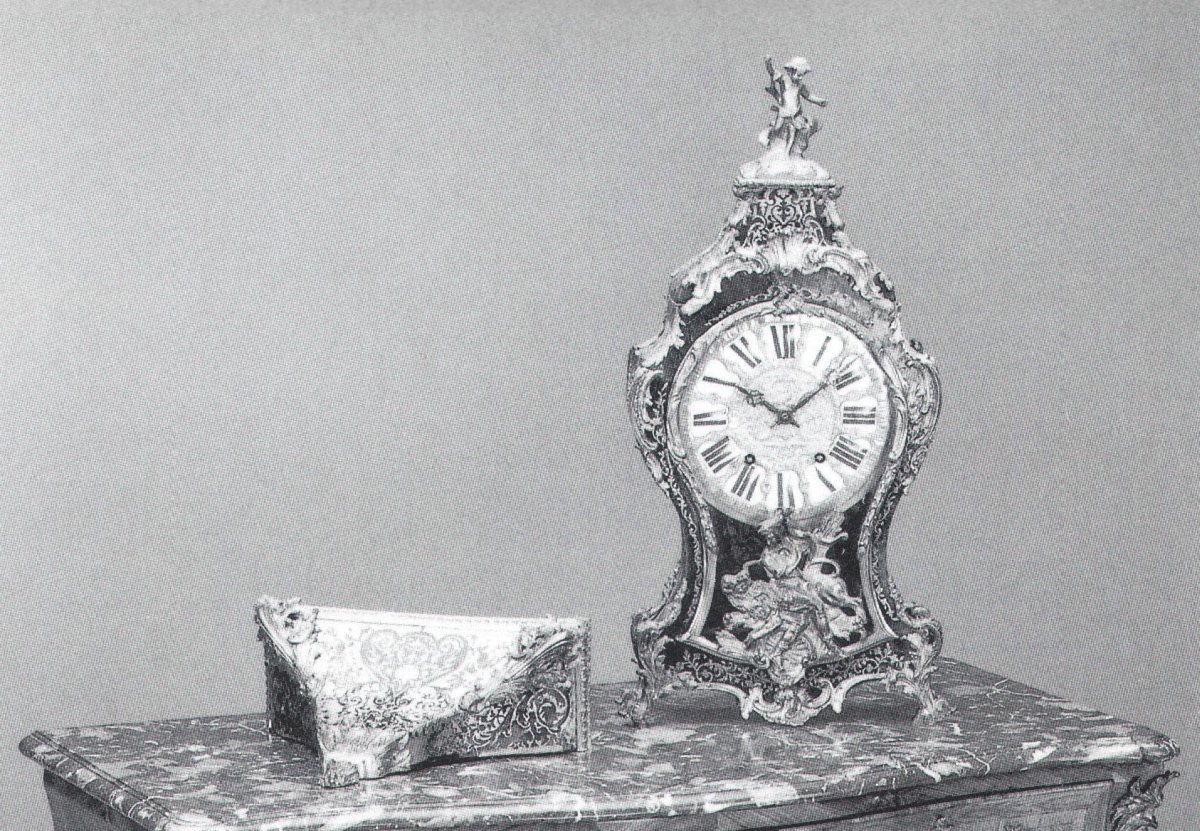 CARTEL ET SON SOCLE, de forme violonée, en bois verni à marqueterie de fleurs et rinceaux feuillagés en laiton. Ornementation en bronze ciselé et doré d'acanthes, rocailles, tores de lauriers, d'un putto pour le fronton, et d'un archer chassant le lion. Amortissement de la console en forme de fruit. Cadran en bronze doré, à décor de coq, mascaron, lambrequin, et à chiffres romains bleus dans des cartouches émaillés. Mouvement à sonnerie signé : «A. F. BRODON PARIS N 2966». (Accidents et restauration. Parfait état de marche.)