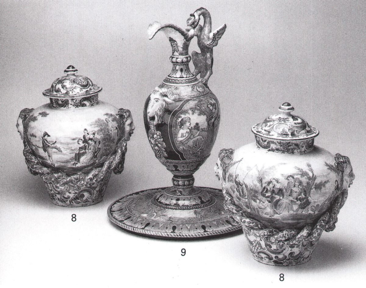 Paire de VASES COUVERTS, en faïence polychrome. Décor peint de scènes galantes et d'éléments rocailles, ceux-ci dans le goût des productions rouennaises du milieu du XVIIIe. Décor rapporté de mascarons liés par des câbles. Marque « R V » sous la base.