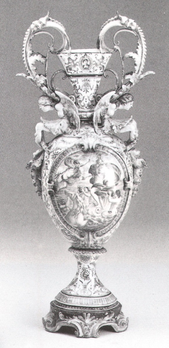 Grand VASE DÉCORATIF sur piédouche, en faïence polychrome, à décor de scènes mythologiques dans des médaillons. Ornementation de grotesques. Les anses sont en forme de sphinges d'où naissent des volutes feuillagées. (Accident.)