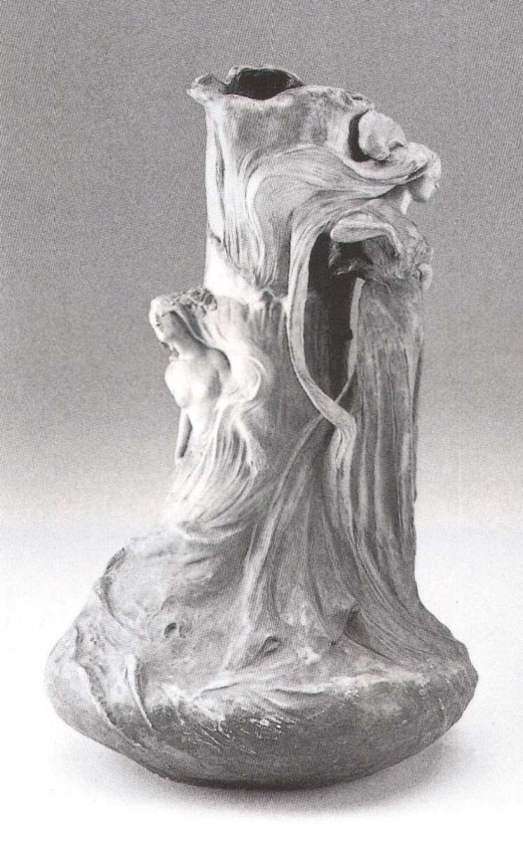 Grand VASE pansu aux naïades, en matière friable. Les naïades sculptées en haut-relief font office d'anses. Signé PÊCHEUR (?). Sous la base figurent la marque de «Friedrich Goldscheider, Wien» sous une allégorie de la sculpture, les nos 0724, 88 et 35 marqués en creux et XI peint.