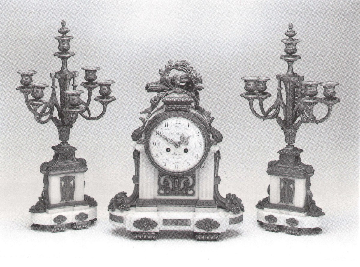 Garniture de cheminée comprenant une PENDULE et deux CANDÉLA¬BRES à six bras de lumière, en marbre blanc et bronze doré et ciselé. Répertoire décoratif Louis XVI: quatre-feuilles, guirlandes, rubans, godrons, cornes d'abondance, fleurs de lotus, trophée. Le cadran est signé Victor Raulin, à Paris, 226, boulevard Saint-Germain.