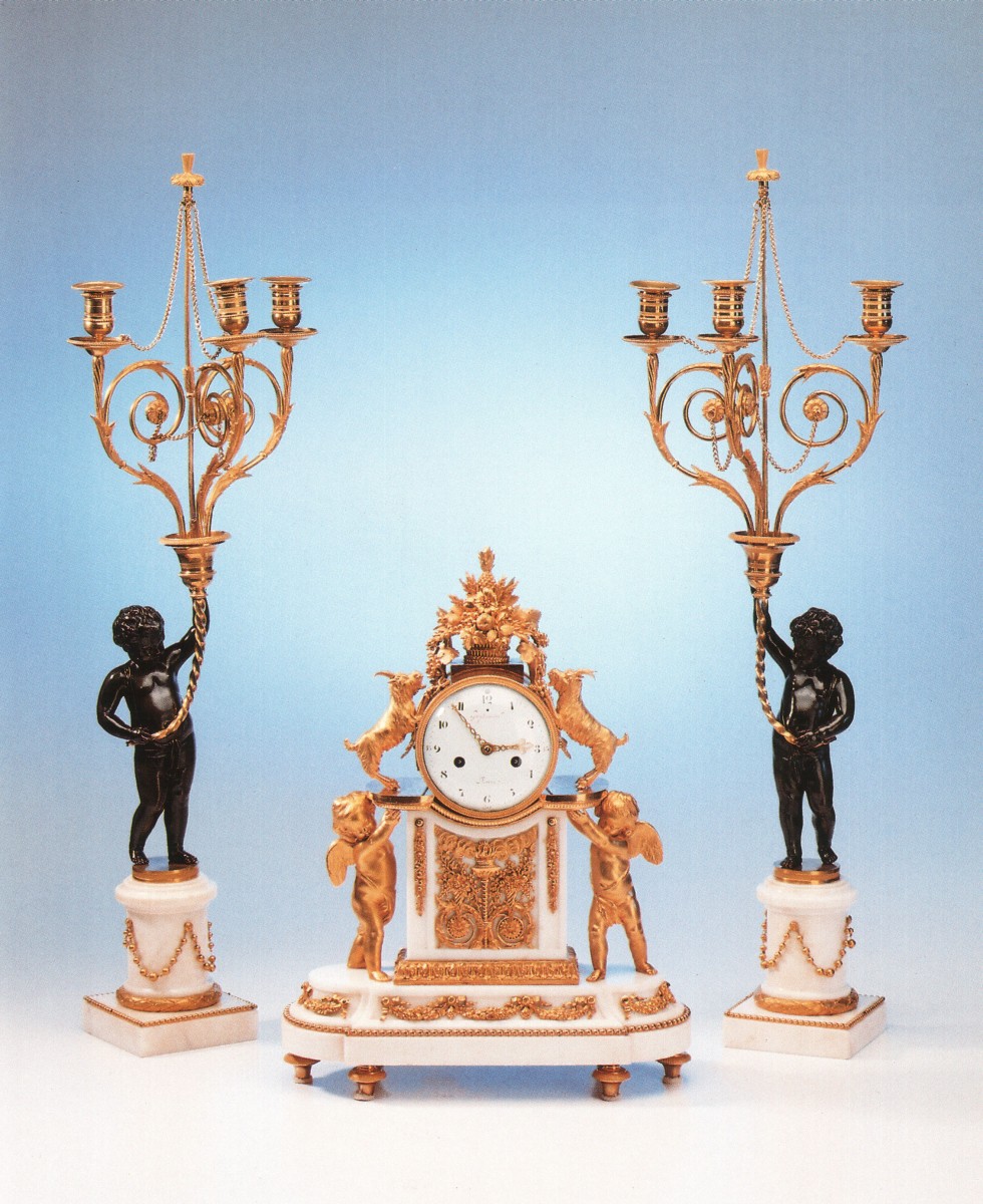 PENDULE à enfant et chèvres de Guydamour. Le socle ovale en marbre blanc, encadré de perles de bronze doré, repose sur six petits pieds. Sur le ressaut central et sur les côtés sont placées des guirlandes de fruits et de fleurs nouées de rubans. Sur ce socle s'élève un pilastre orné à sa base d'une moulure de feuilles d'acanthe et sur sa face principale d'un ornement d'arabesques à cassolette fumante et cornes d'abondance chargées de grappes de rai¬sin. De chaque côté du pilastre, deux cupidons ailés soutiennent un entablement orné de rais de cœur. Sur ce dernier est posé le mouvement encadré de deux chèvres mangeant des grappes de raisin s'échappant d'un panier placé au sommet du mouvement. Sonnerie au passage des heures et des demies. Cadran en émail blanc, avec des chiffres arabes, signé « Guydamour à Paris» en caractère doré.