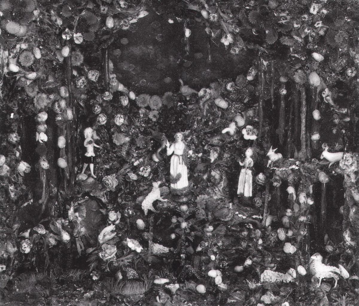 PARADIS TERRESTRE, en verre filé émaillé, coquillages, papier découpé et miroirs de fond: Dieu le père, avec à ses pieds un agneau, est entouré de deux personnages (Adam et Ève, en costumes d'époque), il fait le signe de Rédemption, dans une grotte peuplée d'animaux, et à la végétation luxuriante.