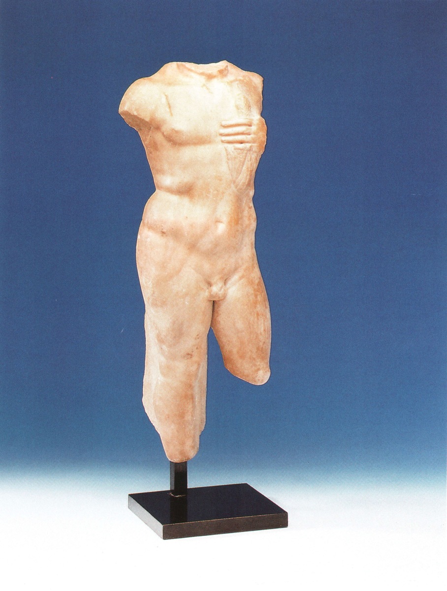 STATUE en marbre avec dépôt calcaire. (Manquent la tête, les bras, la jambe gauche en dessous du genou et le pied droit.) Le corps est appuyé contre une colonne qui prend naissance en bas des fesses. Debout, nu, il tient dans sa main gauche un oiseau appuyé contre sa poitrine.